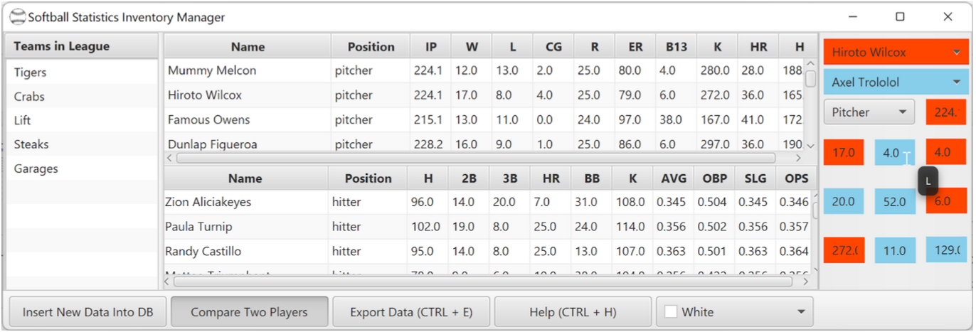 Once the interface has been expanded, the user can then select the team that they would like to insert a new player into. From there, the user can then input the player name and the various statistics. After this occurs, the user will then put in all of the pitcher statistics and the data will be entered successfully into the database.